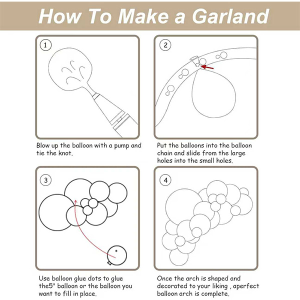 శ్రద్ధ & హెచ్చరిక:దయచేసి బెలూన్లను ఓవర్ఫిల్ చేయవద్దు మరియు వడదెబ్బ, వేడెక్కడం, కోణాల వస్తువు మరియు అధిక రాపిడిని నివారించండి. మీ ఆదర్శ బెలూన్ పరిమాణాన్ని సాధించడానికి, మీ బెలూన్ గార్లాండ్ ఆర్చ్ కిట్స్ పార్టీని ఆస్వాదించడానికి ప్రతి బెలూన్లో గాలిని పెంచే పరిమాణాన్ని నియంత్రించండి.