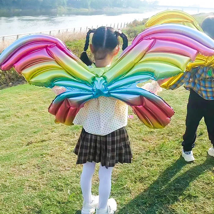 డైనమిక్ విజువల్ ఎఫెక్ట్ను సృష్టిస్తూ, రెక్కలు ప్రత్యేకమైన డిజైన్ మరియు గురుత్వాకర్షణ సర్దుబాటు కేంద్రం ద్వారా కొద్దిగా వంగి ఉంటాయి, సీతాకోకచిలుక యొక్క భ్రమను తక్కువ ఓవర్ హెడ్ సృష్టిస్తుంది. పెరిగినప్పుడు, అవి పక్కకి ఎగిరిపోతున్నట్లు కనిపిస్తాయి. కొన్ని బెలూన్ డిజైన్లలో వింగ్ అంచుల వెంట ఆడంబరం మరియు సీక్విన్స్ కూడా ఉన్నాయి. పరిసర లైటింగ్ కింద, బెలూన్లు మరింత డైనమిక్గా కనిపిస్తాయి, ఏదైనా స్థలానికి శక్తివంతమైన స్పర్శను జోడిస్తాయి.