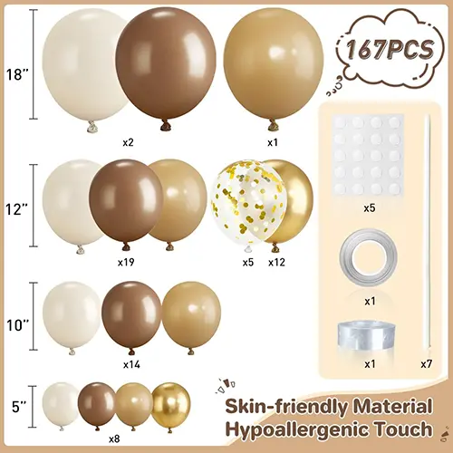 · చేర్చబడిన భాగాలు: ప్రీ-ప్రోపోర్షన్డ్ స్టాండర్డ్ క్యామెల్-కలర్ బెలూన్లు (5 గ్రేడియంట్ షేడ్స్ని కలిగి ఉంటాయి), అధిక-బలపు ఆర్చ్ బేస్, ప్రొఫెషనల్ కనెక్టర్లు, గ్లూ-డాట్ గ్లోవ్లు మరియు సరళీకృత ఇన్స్టాలేషన్ గైడ్.