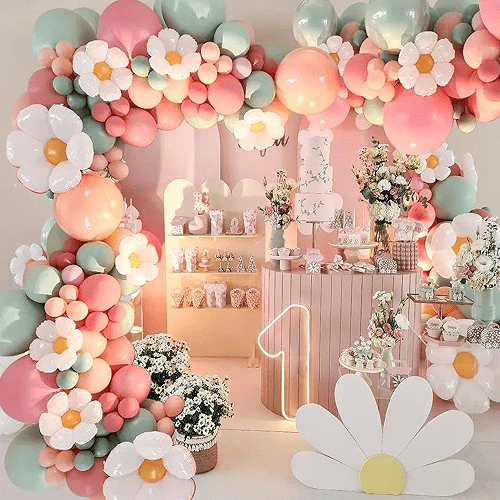 పుట్టినరోజు పార్టీ: డైసీ బెలూన్ గార్లాండ్ పుట్టినరోజు పార్టీలకు నేపథ్య అలంకరణగా ఉపయోగించవచ్చు, పిల్లల లేదా మహిళల పుట్టినరోజు పార్టీలలో ఏర్పాటు చేయడానికి అనుకూలం, సంతోషకరమైన వాతావరణాన్ని సృష్టించడం.