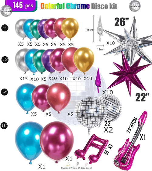 దిడిస్కో బెలూన్ ఆర్చ్ కిట్ప్రధానంగా కలిగి ఉంటుందిరంగురంగుల రబ్బరు బుడగలు మరియువివిధ రేకు బుడగలు. మెరిసే క్రోమ్ స్టైల్ను తయారు చేయడానికి, మేము అందించే రబ్బరు బెలూన్లు మెటాలిక్ రబ్బరు బెలూన్, వాటి ఉపరితలాలు చాలా అందమైన మెటాలిక్ షీన్ను కలిగి ఉంటాయి మరియు అవి ఇంటి లోపల మరియు ఆరుబయట అద్భుతమైన ఫలితాలను సాధించగలవు. వాటి పరిమాణాలు 5 అంగుళాలు, 10 అంగుళాలు, 12 అంగుళాలు మరియు 18 అంగుళాలు.