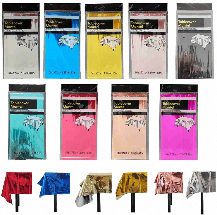 సాధారణ రేకు టేబుల్క్లాత్ పరిమాణాలు 1.37*1.83మీ, 1.37*2.74మీ మరియు గృహ మరియు చిన్న మరియు మధ్య తరహా పార్టీ టేబుల్ల కోసం 1*2.7మీ. వివిధ దృశ్యాల డెస్క్టాప్ లేఅవుట్ అవసరాలను తీర్చడానికి కస్టమర్ అవసరాలకు అనుగుణంగా కొన్ని ఉత్పత్తులను రేకు టేబుల్క్లాత్ పరిమాణం మరియు నమూనాను అనుకూలీకరించవచ్చు.