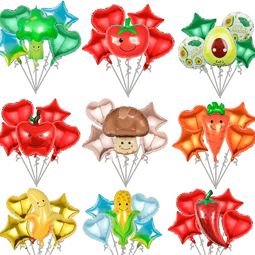 రేకు బెలూన్ సెట్: ఫ్రూట్ ప్లాటర్ లేదా వెజిటబుల్ గార్డెన్ థీమ్ ఎఫెక్ట్ను రూపొందించడానికి వివిధ రకాల కూరగాయలు మరియు పండ్ల రేకు బెలూన్లను కలిపి కలపండి. ఉదాహరణకు, పుచ్చకాయ, స్ట్రాబెర్రీ, నారింజ, అరటి మరియు ఇతర బెలూన్లు, సజీవ పండ్ల థీమ్ వాతావరణాన్ని సృష్టించడానికి.