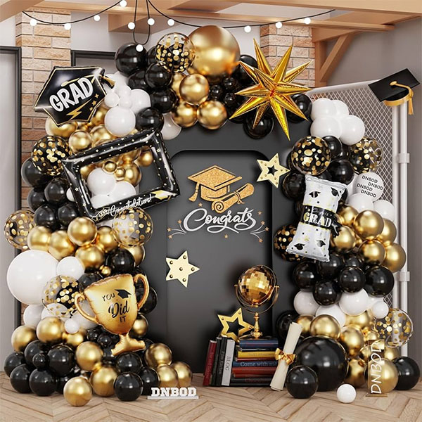 మీ విద్యా దశలో మీరు సాధించిన విజయాలను జరుపుకునే వేడుకలో, మీ గ్రాడ్యుయేషన్ వేడుకను బెలూన్ గార్లాండ్ గ్రాడ్యుయేషన్ ఫాయిల్ బెలూన్తో అలంకరించడం సరైనది. ఈ బెలూన్ గార్లాండ్ నలుపు, బంగారం మరియు తెలుపు వంటి క్లాసిక్ గ్రాడ్యుయేషన్ పార్టీ కలర్ టోన్ని ఉపయోగిస్తుంది. ఈ బెలూన్ గార్లాండ్ సెట్లోని అన్ని రబ్బరు బుడగలు సహజ రబ్బరు పాలుతో తయారు చేయబడ్డాయి మరియు ఖచ్చితంగా పరీక్షించబడ్డాయి మరియు సురక్షితమైన ఉపయోగం కోసం ఎంపిక చేయబడతాయి. మెటాలిక్ లాటెక్స్ బెలూన్లు మరియు గోల్డెన్ కాన్ఫెట్టీ బెలూన్లతో సరిపోల్చండి. మరియు మేము మీ పార్టీకి ఉత్సాహభరితమైన మరియు ఆకర్షణీయమైన గ్రాడ్యుయేషన్ వాతావరణాన్ని సృష్టించడానికి, ఎక్స్ప్లోషన్ స్టార్ బెలూన్, గ్రాడ్యుయేషన్ సర్టిఫికేట్ ఫాయిల్ బెలూన్, ట్రోఫీ ఫాయిల్ బెలూన్, బ్యాచిలర్ హ్యాట్ ఫాయిల్ బెలూన్ మరియు ఫోటో ఫ్రేమ్ ఫాయిల్ బెలూన్ వంటి విభిన్న గ్రాడ్యుయేషన్ ఎలిమెంట్లను కూడా జోడిస్తాము. అదనంగా, మేము ప్యాకేజింగ్ మరియు కవర్ యొక్క గ్రాడ్యుయేషన్ ఫాయిల్ బెలూన్తో బెలూన్ గార్లాండ్ యొక్క ఉచిత అనుకూలీకరణకు కూడా మద్దతు ఇస్తున్నాము. మీరు మీ లోగోను లేదా మీరు అనుకూలీకరించాలనుకుంటున్న కంటెంట్ను మాకు పంపవచ్చు. మీకు సంబంధించిన ప్యాకేజింగ్ ప్రభావాన్ని మీ కోసం రూపొందించే ప్రొఫెషనల్ డిజైన్ డిపార్ట్మెంట్ మా వద్ద ఉంది మరియు మార్కెట్లో మరింత పోటీతత్వం వహించడానికి మరియు మీ బ్రాండ్ లక్షణాలను హైలైట్ చేయడంలో మీకు సహాయం చేయడానికి అదనపు ఛార్జీ ఏమీ లేదు.