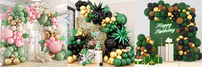 మీరు ఆకుపచ్చ మరియు బంగారు బెలూన్ వంపుతో తెలుపు లేదా పియర్ తెలుపు రంగు బెలూన్లను ఉపయోగించవచ్చు. ఇది మృదువుగా మరియు వెచ్చగా మారుతుంది మరియు వసంత తోట యొక్క తాజాదనాన్ని సంగ్రహించేలా ఉంటుంది; పింక్ కలర్ బెలూన్లతో జత చేసినప్పుడు, అది మసకబారకుండా తియ్యగా ఉండే ఉత్సాహభరితమైన అనుభూతిని సృష్టించగలదు, బేబీ షవర్లు మరియు అమ్మాయి నేపథ్య పార్టీలలో శృంగార వాతావరణాన్ని నింపుతుంది; నలుపు మరియు గోధుమ వంటి లోతైన రంగులతో కలిపినప్పటికీ, ఆకుపచ్చ మరియు బంగారు రంగులు ఆ రంగుల యొక్క లోతు మరియు స్థిరత్వాన్ని దాని అద్భుతమైన రంగు ఉద్రిక్తతతో సమతుల్యం చేయగలవు, ఆధునిక ఇంకా వెచ్చని వేడుక వాతావరణాన్ని రూపొందిస్తాయి.