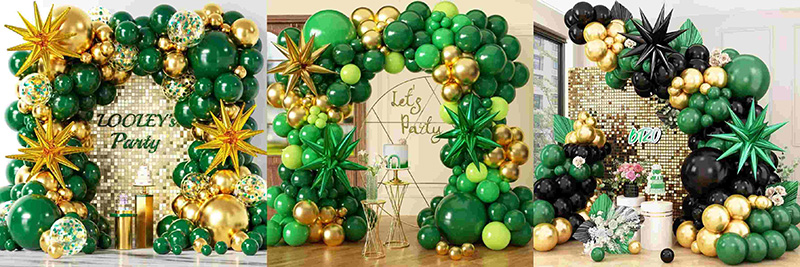 మాట్టే ఆకుపచ్చ, ముదురు ఆకుపచ్చ మరియు ఇతర ఆకుపచ్చ బెలూన్లు బంగారంతో మిళితం అయినప్పుడు, ఆకుపచ్చ రంగు యొక్క విభిన్న షేడ్స్ అడవి జీవితం మరియు పాత-కాలపు సొగసైన వంపులో బంధించబడినట్లుగా అనిపిస్తుంది. బంగారం సూర్యకాంతిలా ప్రకాశిస్తుంది, మొత్తం రంగును ప్రకాశవంతంగా చేస్తుంది. మారుతున్న ఆకుపచ్చ రంగు వంపును ఉల్లాసంగా ఉంచుతుంది మరియు లోహ బంగారం ఆకుపచ్చ రంగును మృదువుగా చేస్తుంది. ఫలితం చాలా రెట్రో పార్టీ సన్నివేశాలకు సరిపోయేలా సహజంగా, గొప్పగా మరియు ఫ్యాన్సీగా అనిపిస్తుంది.
