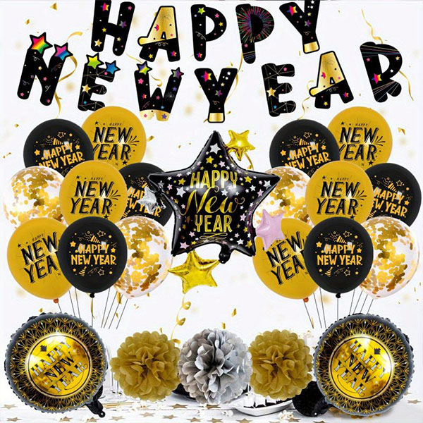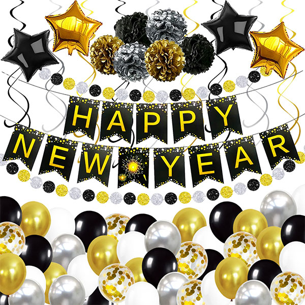 నూతన సంవత్సర నేపథ్య పార్టీ సామాగ్రిలో హాలిడే సమావేశాల కోసం రూపొందించబడిన పూర్తి అలంకరణలు ఉంటాయి, ఇవి త్వరగా వెచ్చగా, సంతోషకరమైన మరియు పండుగ వాతావరణాన్ని సృష్టించడంలో మీకు సహాయపడతాయి.