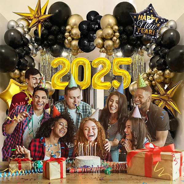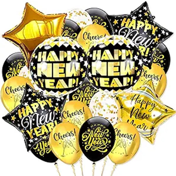 నూతన సంవత్సర నేపథ్య బెలూన్లు సెలవు అలంకరణలో ముఖ్యమైన భాగం. ఈ శక్తివంతమైన బుడగలు, నలుపు మరియు బంగారు రంగులలో, ప్రత్యేకమైన పండుగ టచ్ను సృష్టిస్తాయి, నూతన సంవత్సర వాతావరణానికి ఆనందం మరియు శైలిని అందిస్తాయి. వాటి మన్నికైన ఆకృతి ప్రతి ద్రవ్యోల్బణాన్ని నిరోధిస్తుంది, వాటిని ఎక్కువ కాలం నిండుగా ఉండేలా చేస్తుంది. వారు తో పెంచి చేయవచ్చుహీలియం లేదా గాలి, పూర్తి, త్రిమితీయ రూపాన్ని నిర్వహించడం. అవి ఇండోర్ మరియు అవుట్డోర్ డెకరేషన్ రెండింటికీ సరైనవి.