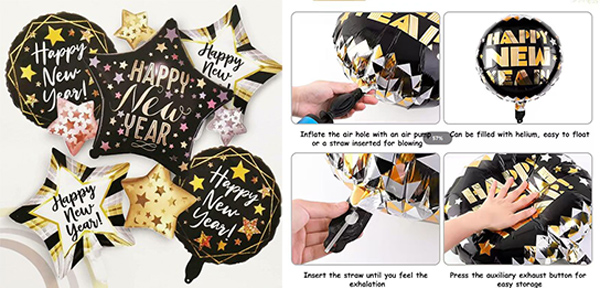 అన్ని హ్యాపీ న్యూ ఇయర్ ఫాయిల్ బెలూన్లు హీలియం-సపోర్టు మరియు పునర్వినియోగపరచదగినవి: బెలూన్ సెట్ హీలియం-సపోర్ట్ మరియు న్యూ ఇయర్ ఈవ్ డెకరేషన్లకు సరైన బ్యాక్డ్రాప్. ద్రవ్యోల్బణం తర్వాత, మైలార్ రేకు న్యూ ఇయర్ బెలూన్ యొక్క ఓపెనింగ్ను చిటికెడు చేయండి మరియు అంటుకునేది స్వయంచాలకంగా మూసివేయబడుతుంది. ఇది ఊదడం మరియు మూసివేయడం సులభం, పెంచడం మరియు తగ్గించడం సులభం మరియు ఎక్కువసేపు తేలుతుంది. మీరు వాటిని తలుపుల వద్ద లేదా పైకప్పులు మరియు గోడలపై ఉంచవచ్చు.