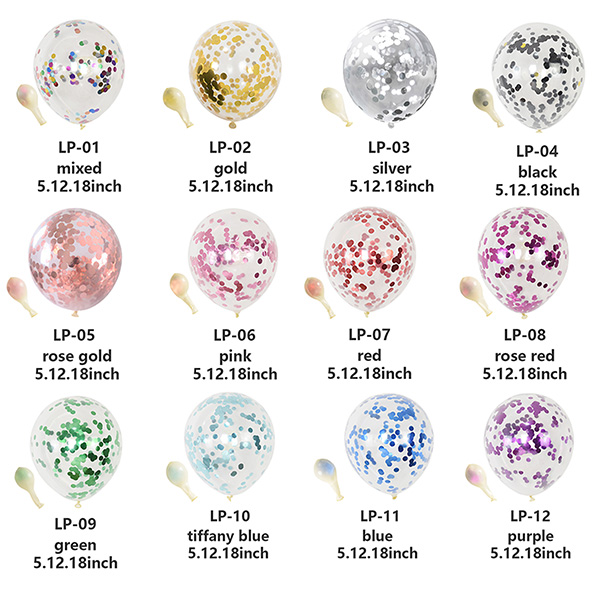 కాన్ఫెట్టి బెలూన్ల యొక్క మా ప్రధాన పరిమాణాలు 5 అంగుళాలు, 10 అంగుళాలు, 12 అంగుళాలు, 18 అంగుళాలు, 36 అంగుళాలు. కన్ఫెట్టి బెలూన్లు కూడా రబ్బరు బెలూన్లకు చెందినవి, కన్ఫెట్టి బెలూన్లు రెండు రకాలుగా విభజించబడ్డాయి, ఒకటి అల్యూమినియం ఫాయిల్ కన్ఫెట్టి బెలూన్లు, మరొకటి పేపర్ కన్ఫెట్టి బెలూన్లు. ఫాయిల్ గ్లిట్టర్ బెలూన్లు ప్రకాశవంతంగా కనిపిస్తాయి మరియు పేపర్ ఫాయిల్ బెలూన్లు మృదువుగా కనిపిస్తాయి. సాధారణంగా రెండు రకాల కాన్ఫెట్టీ బెలూన్లను పుట్టినరోజు పార్టీలు, పెళ్లి పార్టీలు మొదలైన వాటిలో ఉపయోగించవచ్చు. బెలూన్ సెట్ అలంకరణ, బెలూన్ సెట్కు చాలా రంగులను జోడిస్తుంది, అలంకరణను మరింత పరిపూర్ణంగా మరియు అందంగా చేస్తుంది.