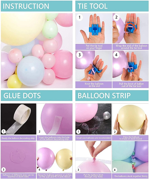 మాకరూన్ ఐస్ క్రీమ్ బెలూన్ ఆర్చ్ గార్లాండ్ కిట్లో వివిధ రంగులు మరియు పరిమాణాల రబ్బరు బెలూన్లు, మాకా పౌడర్, మాకా బ్లూ, మాకా ఎల్లో, మాకా గ్రీన్ మరియు మాకా పర్పుల్, అలాగే వివిధ మాకా రంగులు మరియు రేకు ఐస్ క్రీమ్ బెలూన్ల పొడవైన బెలూన్లు ఉన్నాయి. ఈ బెలూన్లు పెరిగిన తరువాత, అందమైన మాకరూన్ ఐస్ క్రీం బెలూన్ ఆర్చ్ గార్లాండ్ను పూర్తి చేయడానికి అవి బెలూన్ గొలుసులు, జిగురు పాయింట్లు మరియు రిబ్బన్ల ద్వారా సమావేశమవుతాయి. రంగురంగుల మాకరూన్ బెలూన్ ఆర్చ్ గార్లాండ్ను మీ పార్టీ లేదా ఈవెంట్ కోసం ప్రత్యేకంగా రూపొందించవచ్చు. బహిరంగ పార్టీలు, పాఠశాల పార్టీలు, సంస్థ లేదా కుటుంబ పార్టీలు, గ్రాడ్యుయేషన్ వేడుకలు, సెలవు అలంకరణలు మరియు బహిరంగ ఆటలకు ఇది సరైన ఎంపిక, ముఖ్యంగా పిల్లల పుట్టినరోజులు, బేబీ పార్టీలు, లింగ ద్యోతకాలు, యునికార్న్స్, రెయిన్బోస్, మత్స్యకన్యలు, బాలికల ఐస్ క్రీం నేపథ్య పార్టీలు లేదా వివాహాలు, పెళ్లి స్నానం కోసం అలంకరణలు. మీ పార్టీ లేదా ఏదైనా నేపథ్య ఈవెంట్ కోసం రెయిన్బో బెలూన్ థీమ్ను సృష్టించండి.