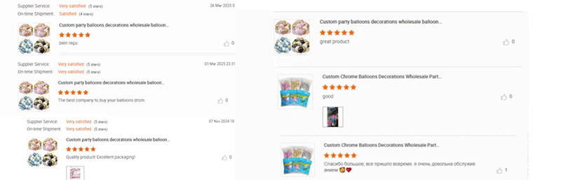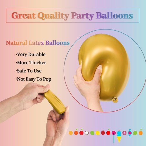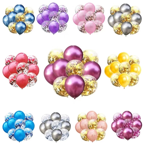 మీరు ప్యాకేజీ కోసం ఒకే మెటాలిక్ రంగును ఎంచుకోవచ్చు. ప్రముఖ ఎంపికలు షాంపైన్ గోల్డ్, మెటాలిక్ గ్రీన్, రోజ్ గోల్డ్ మరియు మొదలైనవి. ఇది మీ దృశ్యాన్ని సరళంగా మరియు కలిసిపోయేలా చేస్తుంది. ఇది నిజంగా బాగా సాగుతుంది. ఇది చాలా అరుదుగా పాప్ అవుతుంది. ఇది ద్రవ్యోల్బణం తర్వాత 12 గంటలకు పైగా నిండుగా ఉంటుంది. మీరు వివిధ మెటాలిక్ షేడ్స్ కూడా కలపవచ్చు. బంగారం మరియు వెండిని కలిసి ప్రయత్నించండి. ఇది లేయర్డ్, ఆకర్షించే ఆకృతిని సృష్టిస్తుంది. ఈ బెలూన్లను కాన్ఫెట్టి లేటెక్స్ బెలూన్లతో కూడా జత చేయండి. మెటాలిక్ బెలూన్ల మృదువైన మెరుపు కన్ఫెట్టి వాటి మెరుపు ఆకృతికి భిన్నంగా ఉంటుంది. మీరు వాటిని షేక్ చేసినప్పుడు కన్ఫెట్టి లోపల చుట్టూ తిరుగుతుంది. ఇది ఏదైనా ప్రదేశానికి వినోదాన్ని మరియు కదలికను జోడిస్తుంది. మెటాలిక్ కలర్ బెలూన్లు పుట్టినరోజు పార్టీలు, వివాహాలు, సెలవు ఈవెంట్లు మరియు స్టోర్ విండో డిస్ప్లేల కోసం చిన్న సెట్లు పని చేస్తాయి. ప్రతి సెట్ కఠినమైన గాలి-బిగింపు మరియు భద్రతా పరీక్షలలో ఉత్తీర్ణత సాధిస్తుంది. ఇది EN71 మరియు CE వంటి అంతర్జాతీయ ప్రమాణాలకు అనుగుణంగా ఉంటుంది. వాటిని పెంచడం సులభం. DIY అనుభవం లేనివారు కూడా వాటిని ఉపయోగించవచ్చు. వారు ప్రొఫెషనల్ ఈవెంట్ ప్లానర్లచే కూడా ఇష్టపడతారు. మీరు అద్భుతమైన వాతావరణంతో ఖాళీని సృష్టిస్తారు.