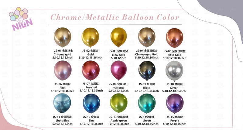 రంగు: మెటాలిక్ బెలూన్లు 15 రంగులను కలిగి ఉంటాయి. అంతులేని విజువల్ ఎఫెక్ట్ల కోసం మీరు వాటిని ఉచితంగా కలపవచ్చు.