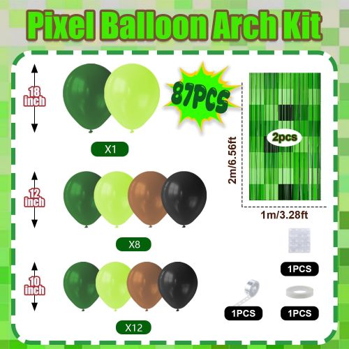 ఈ పుట్టినరోజు Minecraft బెలూన్ ఆర్చ్ కిట్ మాట్టే ముదురు ఆకుపచ్చ, మాట్టే ఆపిల్ ఆకుపచ్చ, మాట్టే నలుపు మరియు మాట్ బ్రౌన్తో కప్పబడి ఉంటుంది. ఇందులో 10 అంగుళాల బెలూన్, 12 అంగుళాల బెలూన్ మరియు 18 అంగుళాల బెలూన్ ఉన్నాయి.