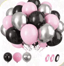 ముద్రించిన బెలూన్లతో కూడిన బెలూన్ సెట్ కోసం ప్రాథమిక లక్షణాలు: వివిధ రంగు బెలూన్లు + కస్టమ్ ప్రింటెడ్ బెలూన్లు + రిబ్బన్లు.
