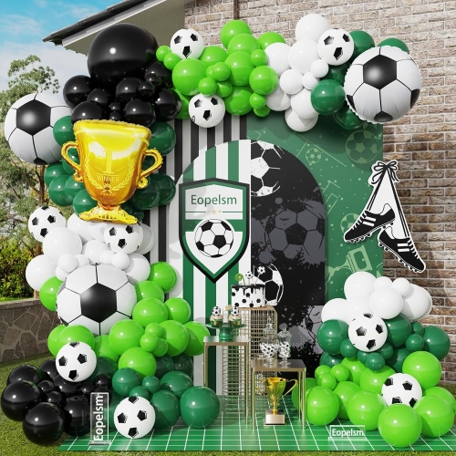 మా సాకర్ బెలూన్ గార్లాండ్ సెట్లు నలుపు మరియు తెలుపు సేకరణలతో సహా బహుళ డిజైన్లను కలిగి ఉంటాయి. అవి ఫుట్బాల్ యొక్క క్లాసిక్ రంగులను సూచిస్తాయి, సాకర్ రేకు బెలూన్ల ద్వారా మరింత ఉచ్ఛరించబడి, నిజమైన సాకర్ను ఆకారంలో మరియు వివరంగా పోలి ఉండేలా జాగ్రత్తగా రూపొందించబడ్డాయి. అవి ఇతివృత్తాన్ని పెంచుతాయి. మేము ఆకుపచ్చ, తెలుపు మరియు నలుపు సిరీస్ల కలయికలను కూడా అందిస్తాము. పచ్చని పచ్చని పిచ్లో ఫుట్బాల్లు ఆనందంగా తిరుగుతున్న పచ్చటి పచ్చికను ఆకుపచ్చ రంగు సూచిస్తుంది. వారు శక్తివంతమైన, లీనమయ్యే మరియు ప్రామాణికమైన స్టేడియం వాతావరణాన్ని సృష్టిస్తారు.
