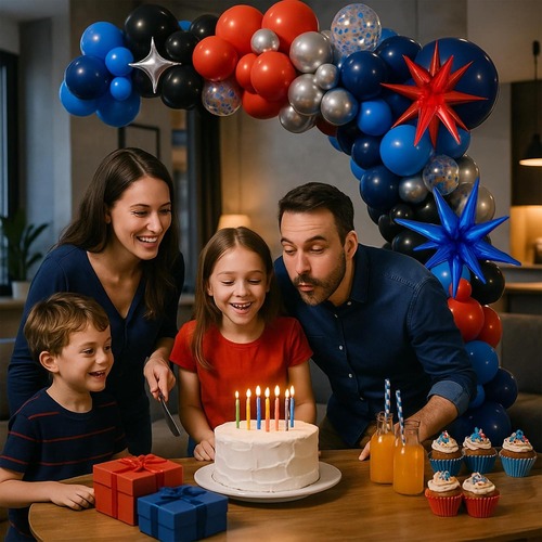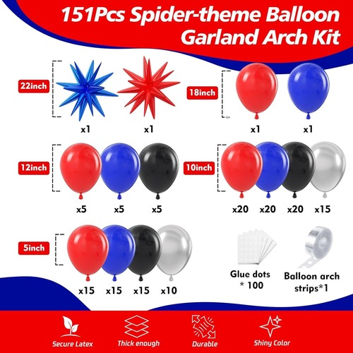 బెలూన్ సెట్ యొక్క ప్రధాన రంగులు నీలం, ఎరుపు మరియు నలుపు. విలక్షణమైన మూడు రంగులు చలనచిత్రంలోని స్పైడర్ మాన్ యొక్క అద్భుతమైన రూపాన్ని మీరు ఊహించేలా చేస్తాయి. ఈ సెట్లోని లేటెక్స్ బెలూన్లు మాట్ రెడ్ బెలూన్, మ్యాట్ బ్లూ బెలూన్, మ్యాట్ బ్లాక్ బెలూన్, మెటాలిక్ స్లివర్ బెలూన్లు ఉన్నాయి. ఈ సెట్లోని రేకు బెలూన్ పేలుడు స్టార్ రేకు బెలూన్, రంగు నీలం మరియు ఎరుపు.